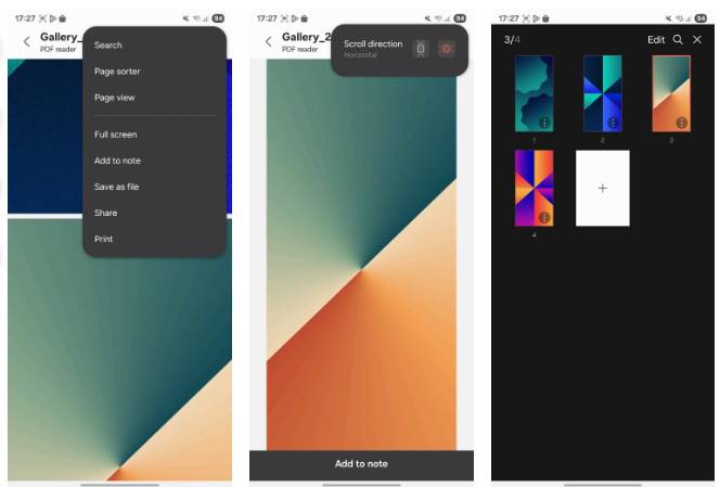 Chờ vài giây và bạn sẽ thấy một file PDF trên màn hình - mở trong trình đọc và chỉnh sửa PDF của ứng dụng Samsung Notes. Bạn có thể chú thích và chỉnh sửa file PDF tại đây. Ngoài ra, bạn có thể thay đổi hướng cuộn - giữa ngang và dọc - bằng cách nhấn vào menu ba chấm ở góc trên bên phải, chọn Page view và chọn thứ tự bạn muốn. Tương tự, bạn có thể chọn Page sorter và thay đổi thứ tự hình ảnh xuất hiện trong file PDF.