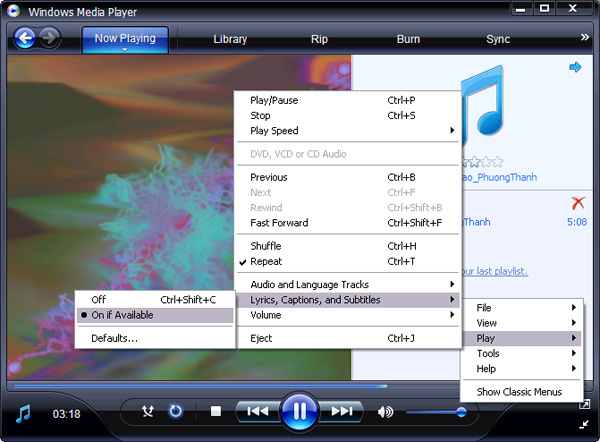 Bạn chạy chương trình Windows Media Player, nhấp chuột phải lên thanh công cụ, chọn Play > Lyrics, Captions, and Subtitles > On if Available.