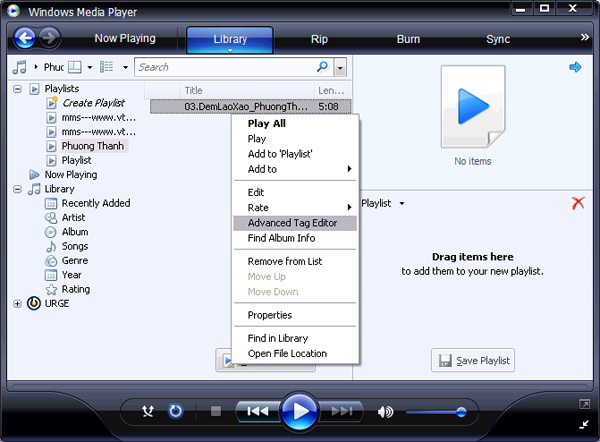 Tiếp theo bạn vào library, tạo một Playlists mới bằng cách nhấp chuột vào Create Playlists. Thêm bài hát vào playlists vừa tạo, chọn và nhấp phải chuột vào bài hát, chọn Advanced Tag Editor > Lyrics > Add.