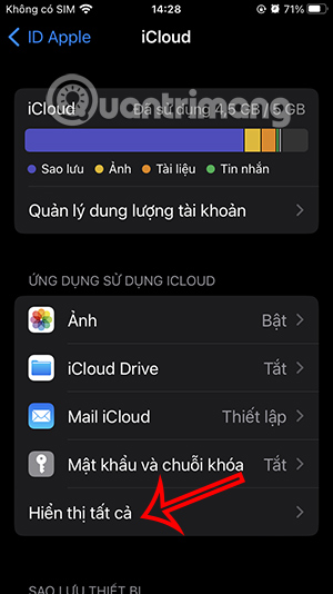 Chúng ta nhấn vào tài khoản Apple của mình rồi nhấn vào iCloud. Lúc này người dùng nhấn Hiển thị tất cả để xem danh sách các ứng dụng đồng bộ iCloud. Nếu ứng dụng nào gặp lỗi đồng bộ bạn tắt đi và bật lại để sửa.