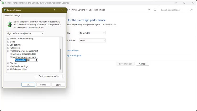 Nếu mục tiêu của bạn là giữ máy mát hơn, giảm tiếng quạt hoặc tiết kiệm pin cho laptop, bạn có thể đặt giới hạn cho mức hoạt động tối đa của CPU. Trong phần tùy chỉnh Power Plan, bạn chỉ cần giảm “Maximum processor state” xuống mức khoảng 80–85% là đã thấy sự khác biệt rõ rệt. Máy sẽ mát hơn nhưng vẫn đủ mạnh cho các công việc nhẹ như lướt web, chat hoặc gõ tài liệu.