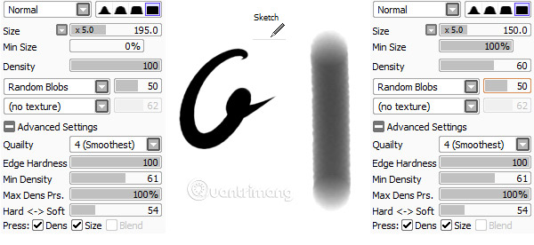 Edge Shape làm cho nét vẽ của bạn mềm hoặc cứng, và có thể làm bản vẽ của bạn trở nên thú vị hơn. Sử dụng Size, bạn có thể làm cho brush của mình rất nhỏ để vẽ chi tiết hoặc rất lớn để sử dụng cho các khối màu và các vùng màu đồng nhất. Min Size là lượng màu sẽ lấp đầy các cạnh của nét vẽ. Density trong trường hợp này kiểm soát độ mờ của công cụ vẽ.