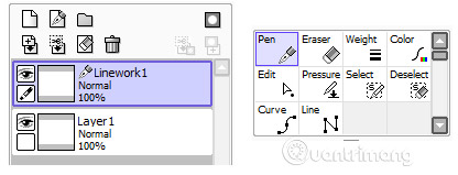 - New Layer tạo một layer mới như bình thường, trong khi New Linework Layer mở các công cụ vector cho bạn. New Layer Set hoạt động như một nhóm layer, vì vậy khi làm việc, bạn có thể sắp xếp các layer của mình để không làm mọi thứ rối tung.