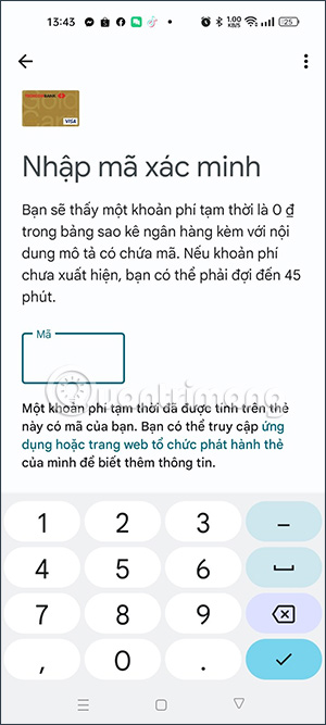 Sau đó bạn chờ một lát để hệ thống ngân hàng xác nhận thông tin cùng ứng dụng Google Wallet. Tại mục Điều khoản của tổ chức phát hành thẻ, chọn Đồng ý để chuyển sang bước tiếp theo.