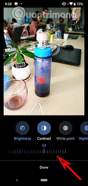 Bạn nhấn vào từng mục để chỉnh sửa hình ảnh. Từng mục chỉnh sửa sẽ đều có thanh trượt để điều chỉnh mức độ thích hợp. Nhấn Done để lưu lại.