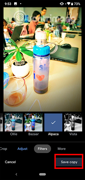 Chuyển sang mục Filters để chỉnh sửa bộ lọc cho ảnh. Sau khi đã hoàn thành xong việc chỉnh sửa bạn nhấn vào Save Copy. Ảnh tự động được lưu vào album ảnh trên thiết bị.