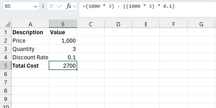 =(1000 * 3) - ((1000 * 3) * 0.1)Có một vài vấn đề ở đây khiến công thức này trở nên phức tạp. Vấn đề nổi bật nhất là phép tính subtotal (1000 * 3) được lặp lại hai lần, khiến công thức khó đọc. Điều này cũng không tốt cho hiệu suất, vì Excel lặp lại phép tính thay vì chỉ sử dụng lại kết quả.