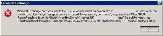 Mặc dù toàn bộ Exchange Management Console được xây dựng dựa trên PowerShell nhưng có một điểm thực sự nổi bật hơn nhiều là phần thông báo lỗi. Tôi gặp phải điều này khi mở trình xem hàng đợi và ngừng dịch vụ msexchangetransport. Bạn có thể thấy trên Hình 12 các lỗi lệnh PowerShell trên phần output của giao diện Queue Viewer.