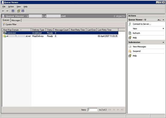 Bây giờ bạn có thể thấy, snap-in MMC v3 được dùng cho trình xem hàng đợi có giao diện người dùng rất đơn giản. Mặc định trình xem mở và hiển thị các hàng đợi cho server truyền vận bạn đang đăng nhập vào. Để kết nối tới một server khác, sử dụng tuỳ chọn Connect to Server ở khung bên phải: