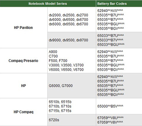 Các dòng máy tình có thể có pin nằm trong diện này là HP, HP Pavilion, Compaq Presario, Compaq và các model khác sản xuất trong khoảng từ tháng 8 năm 2007 tới tháng 5 năm 2008.
