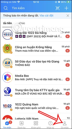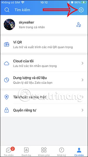 Tại giao diện ứng dụng trên Zalo, người dùng nhấn vào mục Cá nhân ở góc dưới cùng bên dưới màn hình. Tiếp đến chuyển sang giao diện mới, nhấn vào biểu tượng bánh răng cưa ở góc phải trên cùng.