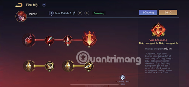 Veres là vị tướng cần bộ phù hiệu có khả năng công kích cao, chống chịu tốt, do đó bạn nên sử dụng bộ phù hiệu chính là Vực hỗn mang và phụ là Tháp quang minh.