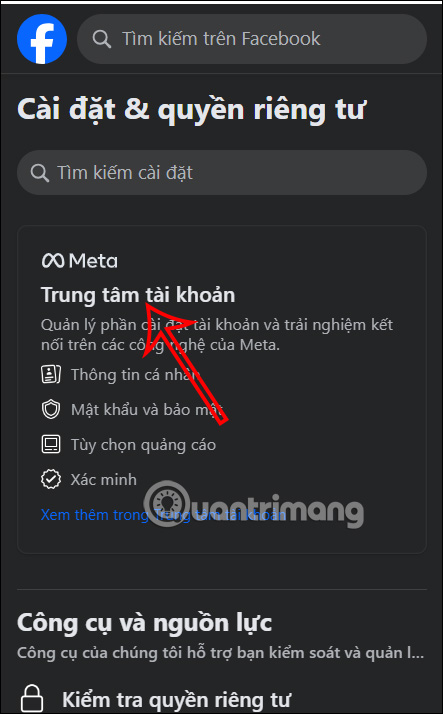 Tiếp tục ở giao diện mới bạn nhấn vào mục Trung tâm tài khoản để truy cập các mục thiết lập cho tài khoản của bạn. Ở giao diện như hình bạn nhấn chọn vào tên tài khoản Facebook của bạn.