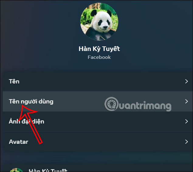 Tiếp tục chọn vào tài khoản Facebook của bạn. Tại giao diện này bạn nhấn tiếp vào mục Tên người dùng để chỉnh lại ID Facebook.