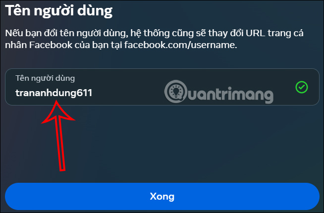 Bạn sẽ nhập tên ID mới vào khung này, nếu tên được xác định khả dụng thì bạn nhấn Xong ở bên dưới để lưu lại ID mới cho Facebook.
