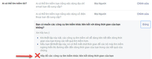 Đây là một phần khá quan trọng, mọi người có thể dùng Google để tìm kiếm các nội dung mà bạn đã chia sẻ, bỏ dấu tick ở phần "Hãy để các công cụ tìm kiếm khác liên kết dòng thời gian của bạn" tại mục "Bạn có muốn các công cụ tìm kiếm khác liên kết với dòng thời gian của bạn không?".