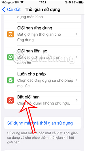 Trong thiết lập giới hạn trên iPhone, chúng ta sẽ cần kích hoạt chế độ Bật giới hạn để sử dụng các thiết lập có trong tính năng này.