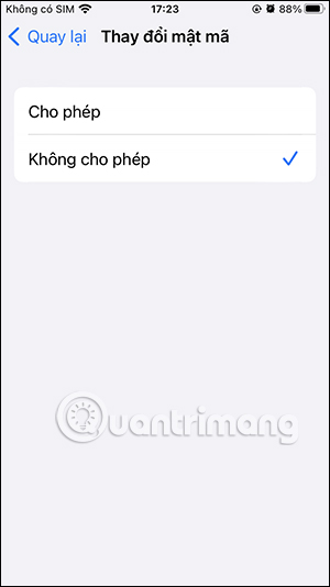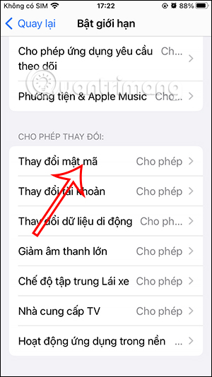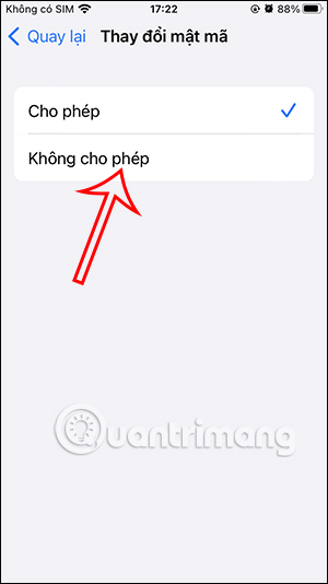 Bạn kéo xuống bên dưới cùng tới mục Cho phép thay đổi. Nhấn vào tùy chọn Thay đổi mật mã. Lúc này bạn cần đổi sang chế độ Không cho phép để chặn người khác đổi mật khẩu trên iPhone.