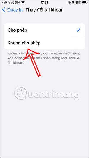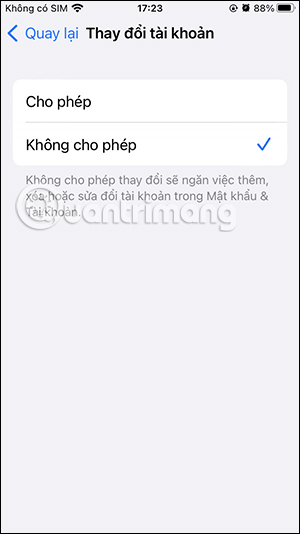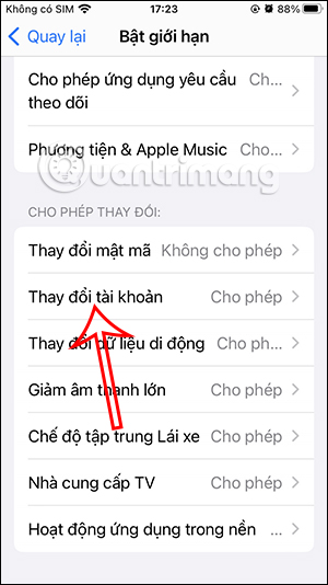 Quay trở lại giao diện Bật giới hạn rồi nhấn vào tùy chọn Thay đổi tài khoản. Tại đây bạn cũng chuyển sang chế độ Không cho phép để người khác không đổi tài khoản trong mục Mật khẩu & Tài khoản.