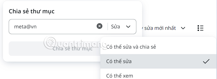 Sau đó bạn chọn chế độ chia sẻ thư mục Canva cho đối tượng này với tùy chọn chỉ có thể xem, có thể sửa và có thể chia sẻ tiếp thư mục này.