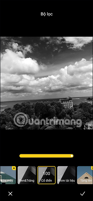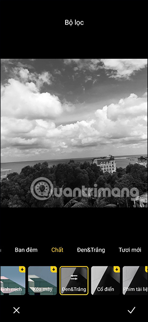 Trong mục bộ lọc, chúng ta sẽ nhấn vào kiểu bộ lọc màu Đen&Trắng để chỉnh sửa hình ảnh. Tại đây bạn sẽ nhìn thấy có 3 kiểu chỉnh ảnh đen trắng, gồm kiểu Đen & Trắng, Cổ điển, Phim tài liệu. Bạn sẽ nhấn vào từng kiểu ảnh đen trắng để thử cho hình ảnh trước khi áp dụng.
