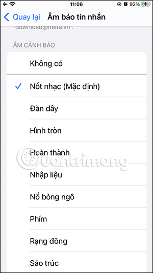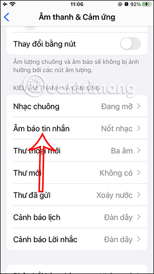 Sau đó chuyển sang giao diện mới, bạn tiếp tục nhấn vào mục Âm báo tin nhắn để điều chỉnh. Sau đó hiển thị các âm thông báo khác nhau để lựa chọn.