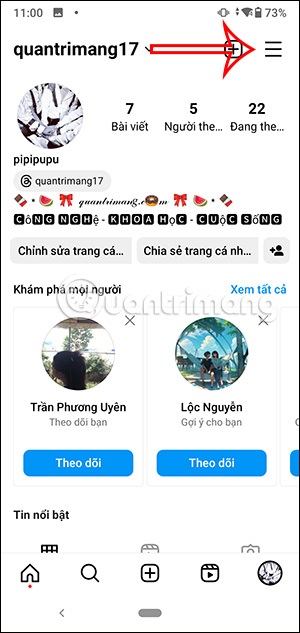 Tại giao diện trên ứng dụng Instagram, chúng ta nhấn vào ảnh hồ sơ ở bên dưới. Tiếp đến, chuyển sang giao diện mới người dùng nhấn vào biểu tượng 3 dấu gạch ngang.