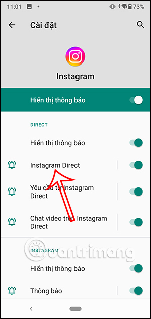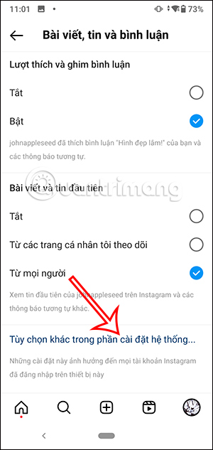 Ở phần điều chỉnh thông báo, bạn kéo xuống bên dưới rồi nhấn chọn vào Tùy chọn khác trong phần cài đặt hệ thống. Ngay lập tức bạn được chuyển sang giao diện chỉnh thiết lập cho ứng dụng Instagram, chúng ta lựa chọn loại âm thông báo Instagram muốn đổi chẳng hạn Instagram Direct để chỉnh âm báo tin nhắn.
