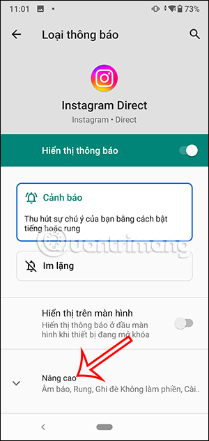 Lúc này bạn nhấn vào mục Nâng cao để điều chỉnh thông báo. Bạn tiếp tục nhấn vào mục Âm báo để điều chỉnh. Sau đó sẽ hiển thị thêm âm thanh để người dùng lựa chọn cho thông báo trên Instagram.