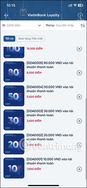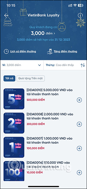 Lúc này người dùng sẽ nhìn thấy điểm thưởng của bạn, thời hạn sử dụng của điểm thưởng này. Bên dưới là danh sách các quà tặng mà VietinBank muốn gửi tặng tới chúng ta. Chúng ta lựa chọn loại quà mà bạn muốn trong danh sách này.