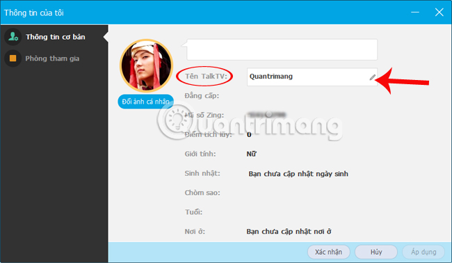 Quay trở về giao diện Thông tin của tôi sẽ thấy tên mới đặt cho tài khoản TalkTV xuất hiện, trong mục Tên TalkTV. Bạn cần nhấn vào nút Xác nhận ở dưới để hoàn thành mọi thao tác thay đổi trên tài khoản.