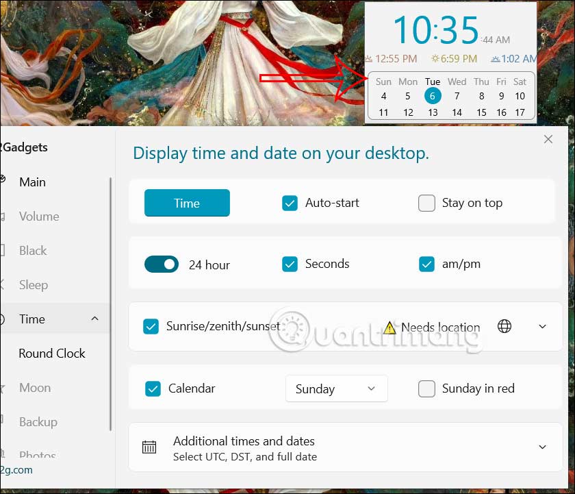 Nếu nhấn vào phần Time bạn sẽ điều chỉnh thêm về thông tin hiển thị như hiện thêm giây, thêm AM/PM, thêm tọa độ để hiển thị thời gian mặt trời mọc/ mặt trời lặn,…