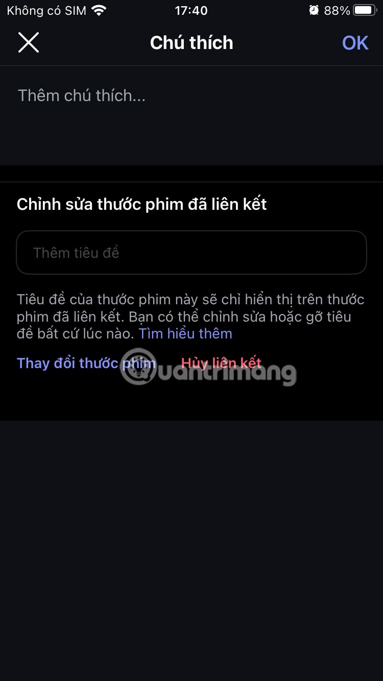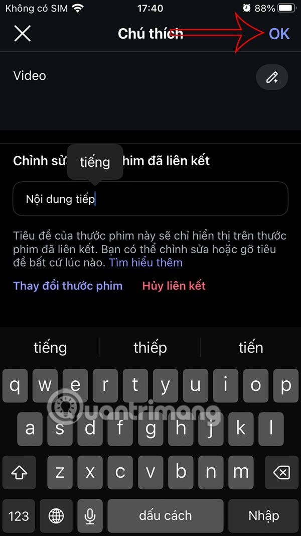 Nhấn chọn video muốn liên kết rồi nhập chú thích cho video Reels, tiêu đề cho đoạn phim của bạn cũng bị giới hạn ở mức 15 từ. Nhập xong nhấn OK để lưu lại.