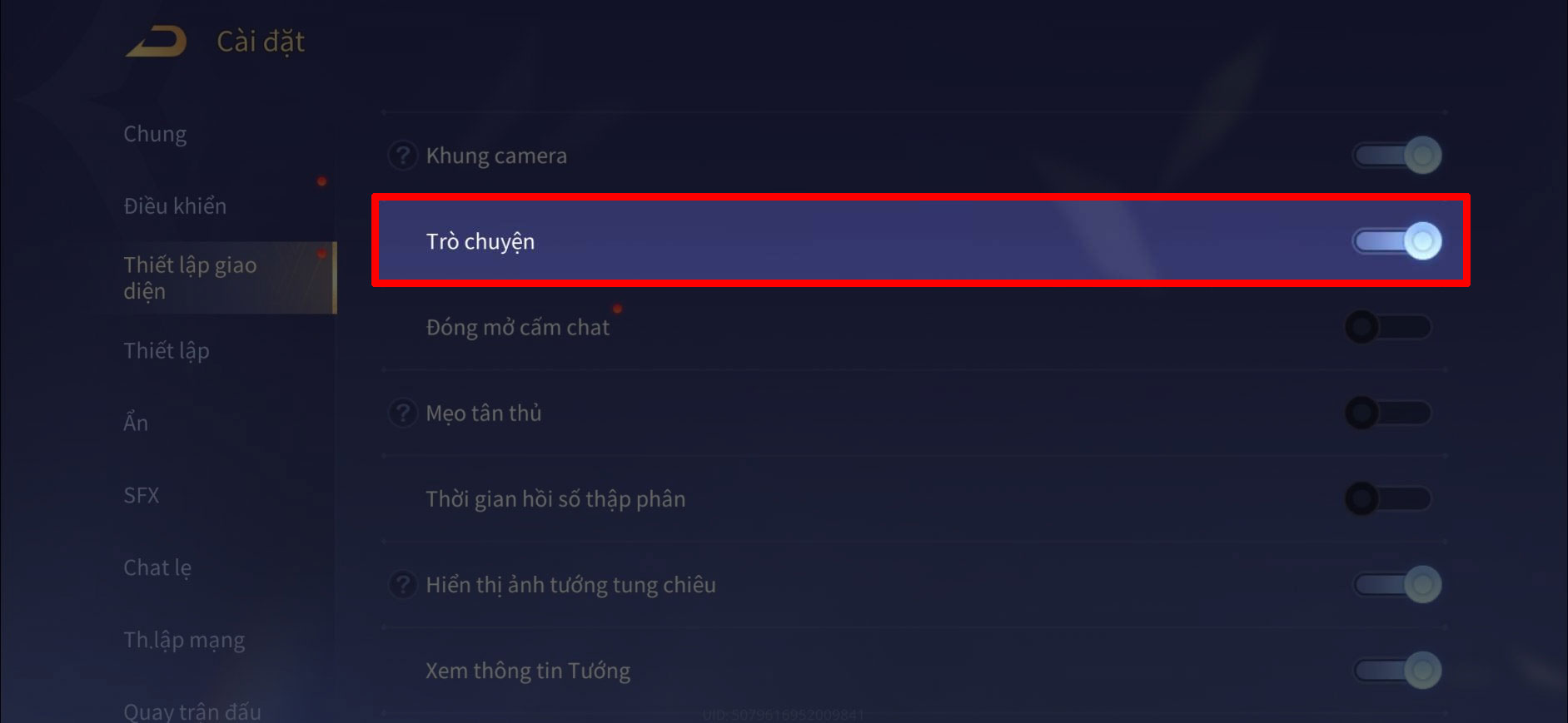 Nhìn sang bên phải bạn sẽ thấy mục Trò chuyện, lúc này bạn cần bật chế độ Trò chuyện để hiển thị khung chat trong khi chơi game Liên Quân Mobile.