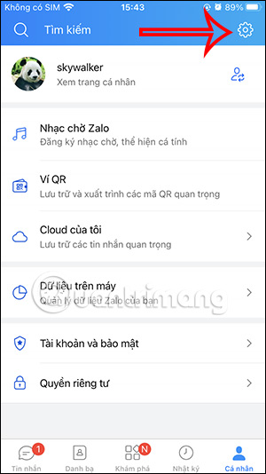 Tại giao diện trên ứng dụng Zalo, người dùng nhấn chọn vào mục Cá nhân ở bên dưới. Tiếp đến chúng ta nhấn vào biểu tượng bánh răng cưa ở góc phải trên cùng màn hình.