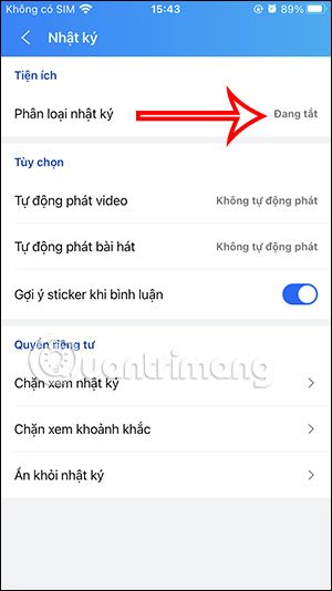 Chuyển sang giao diện các thiết lập cho tài khoản Zalo. Tại đây người dùng nhấn chọn vào mục Nhật ký để điều chỉnh. Tiếp tục, ở giao diện như hình người dùng sẽ thấy tùy chọn Phân loại nhật ký để bạn kích hoạt.