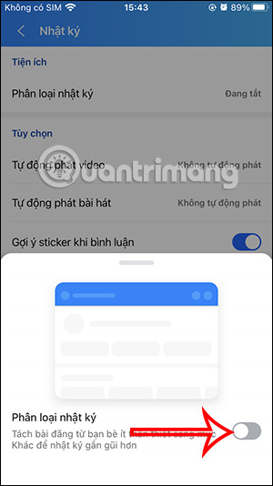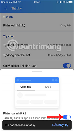 Lúc này bạn cần gạt nút tròn trắng sang phải để kích hoạt chế độ phân loại nhật ký trên Zalo.