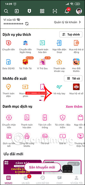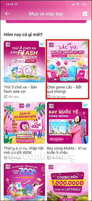 Chúng ta đăng nhập tài khoản MoMo của mình. Tiếp đến tại giao diện trên MoMo bạn nhấn vào mục Vé máy bay. Ngay sau đó bạn sẽ nhìn thấy chương trình ưu đãi Lắc Vi Vu MoMo để bạn nhấn chọn.