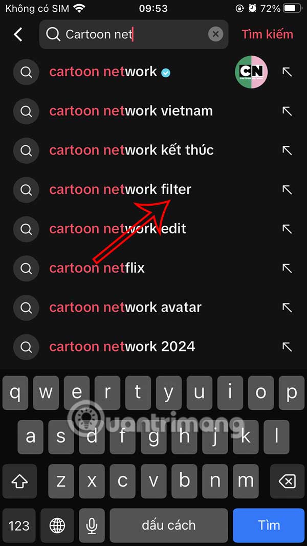 Tại giao diện trên ứng dụng TikTok bạn nhấn vào biểu tượng kính lúp ở góc phải bên trên để tìm kiếm hiệu ứng. Hiển thị giao diện mới, bạn nhập từ khóa cartoon network, sau đó nhấn vào Cartoon Network filter hiển thị ở bên dưới để sử dụng.