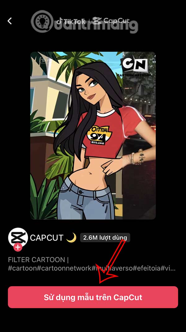 Trong giao diện xem trước hiệu ứng Cartoon Network, bạn nhấn vào Thử mẫu này. Chúng ta nhấn chọn vào Sử dụng mẫu này trên CapCut.