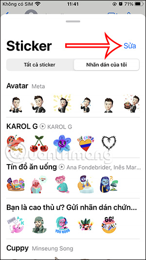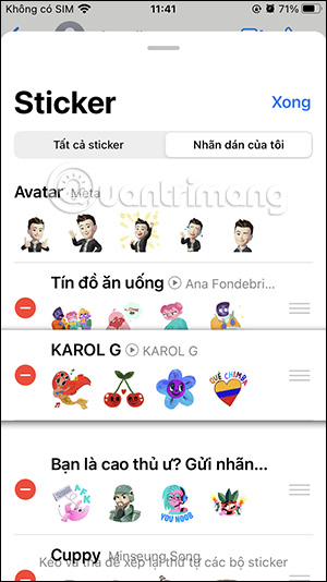 Bạn nhấn vào kho quản lý sticker WhatsApp rồi nhấn vào Nhãn của tôi rồi nhấn tiếp vào Sửa. Hiển thị giao diện điều chỉnh sticker. Tại đây chúng ta có thể sắp xếp thứ tự hiển thị sticker để gói sticker nào bạn hay dùng cho lên trước.
