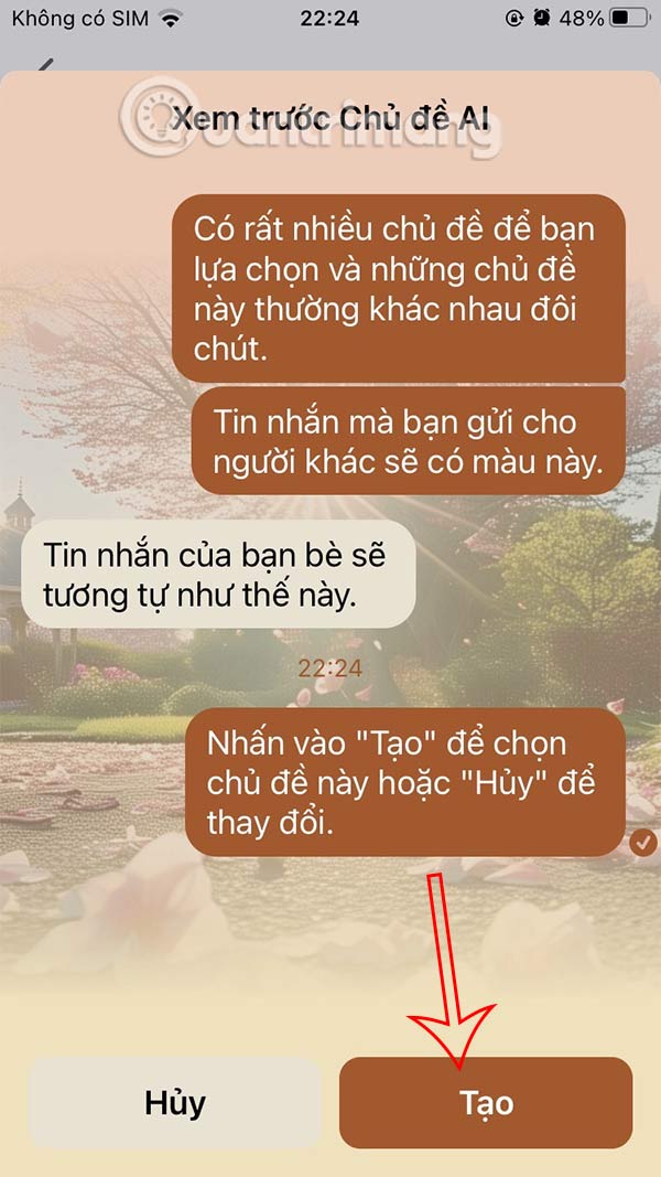 Ngay sau đó người dùng sẽ nhìn thấy giao diện chat trên Messenger chuyển sang giao diện AI mà bạn đã nhập mô tả. Nếu ưng ý thì chúng ta nhấn chọn Tạo để cài chủ đề AI cho giao diện tin nhắn Messenger của mình.