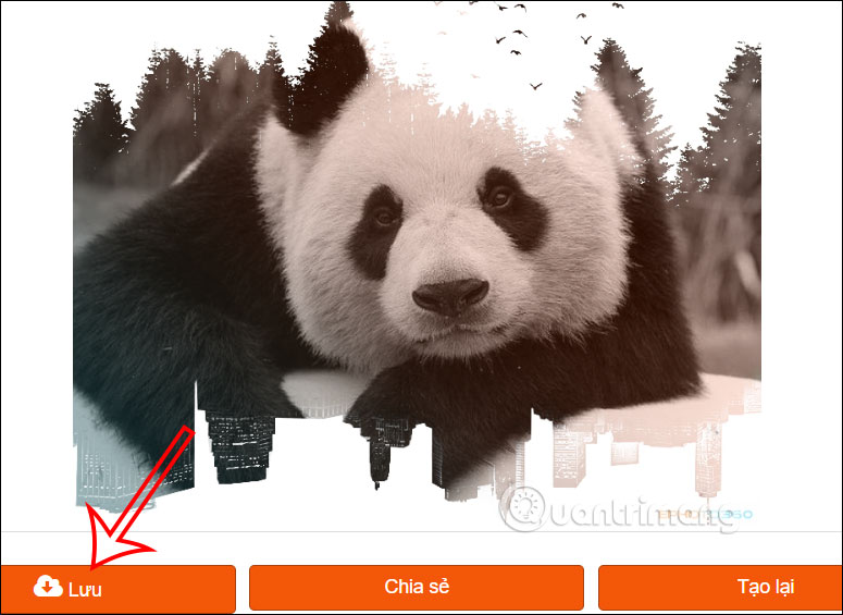 Kết quả chúng ta được hình ảnh hiệu ứng chồng rừng và thành phố như hình dưới đây. Nếu ưng ý thì bạn nhấn vào nút Lưu để tải xuống. Ngoài ra còn có thêm tùy chọn chia sẻ hình ảnh ở bên dưới để bạn sử dụng nếu có nhu cầu.