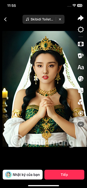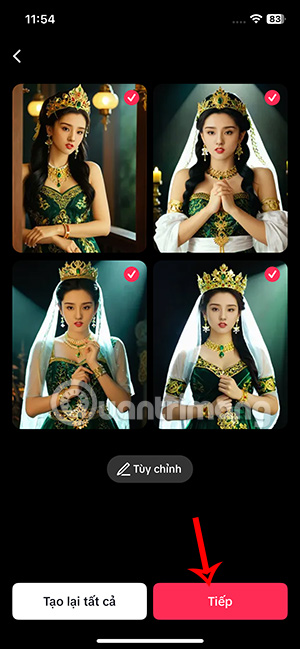 Lúc này bạn sẽ thấy video với hình mẫu ngẫu nhiên tạo trên TikTok như hình dưới đây. Nhấn Tạo video để thực hiện. Chúng ta sẽ nhìn thấy 4 ảnh tạo bởi AI Self như hình dưới đây, theo một chủ đề hình mẫu. Chúng ta có thể dùng cả 4 ảnh hoặc bỏ ảnh rồi nhấn Tiếp bên dưới.