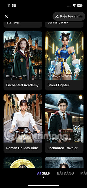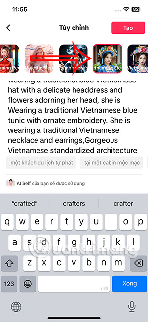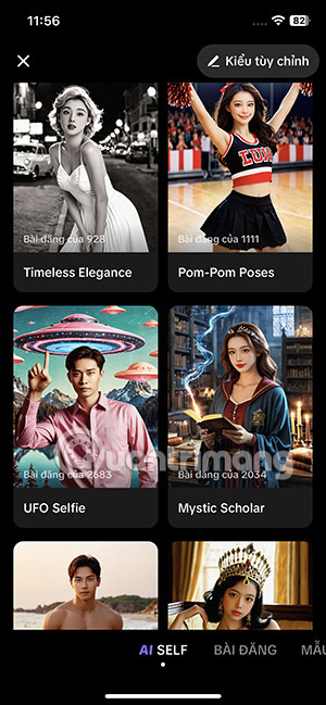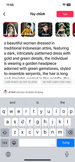 Ngoài ra AI Self TikTok còn cho phép bạn thay đổi lại nội dung tạo ảnh AI. Trong giao diện ảnh AI bạn nhấn vào Tùy chỉnh. Lúc này bạn có thể đổi lại nội dung mô tả tạo ảnh AI. Hoặc có thể nhấn vào hình mẫu khác để tạo mẫu AI Self mới.