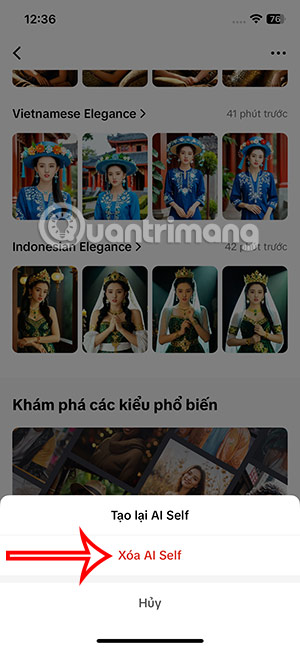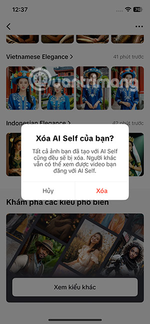 Nếu muốn xóa tất cả nội dung AI Self đã tạo, bạn nhấn vào biểu tượng 3 dấu chấm rồi chọn Xóa AI Self.