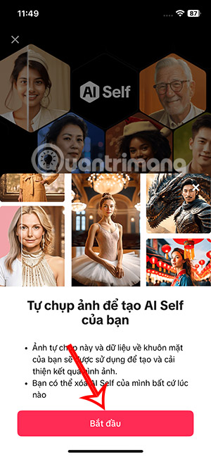 Lúc này bạn sẽ thấy giao diện giới thiệu cho tính năng AI Self trên TikTok, nhấn Bắt đầu để sử dụng. Sau đó bạn sẽ chuyển sang giao diện chụp ảnh gương mặt để tạo video AI Self.