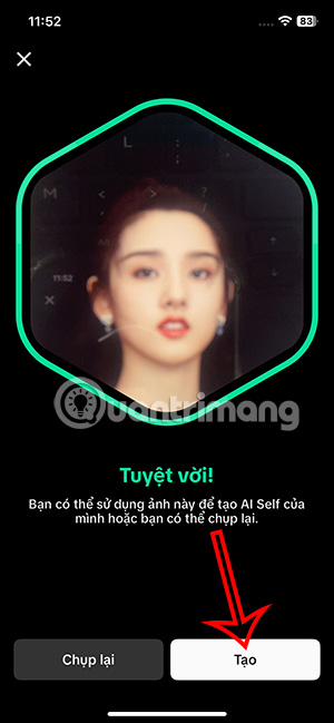 Bạn di chuyển gương mặt trong khung hiển thị trên màn hình sau đó chụp ảnh lại. Chụp xong gương mặt thì nhấn Tạo để dùng.