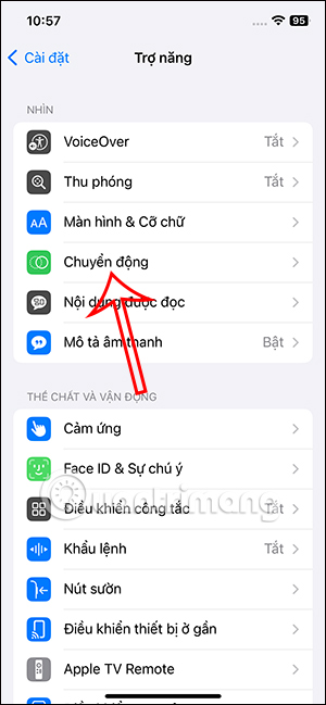 Đầu tiên người dùng nhấn vào mục Cài đặt trên iPhone để thay đổi lại thiết lập. Tiếp đến, bạn nhấn vào mục Trợ năng để điều chỉnh. Hiển thị giao diện tùy chỉnh mới, người dùng nhấn vào mục Chuyển động.