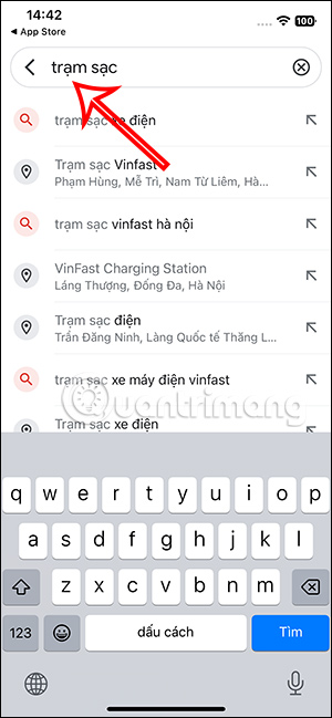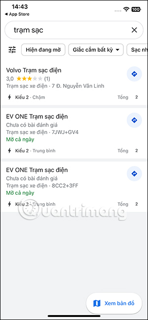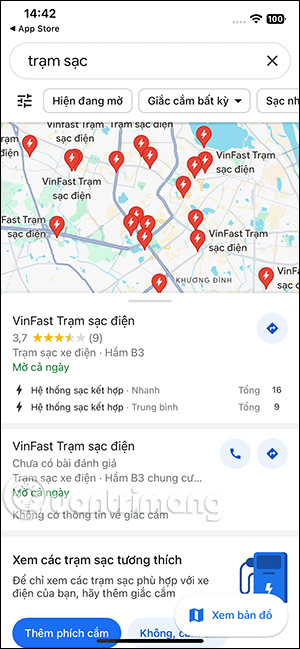 Lúc này bạn sẽ thấy được danh sách trạm sạc dựa trên phích cắm mà chúng ta đã lựa chọn. Bạn nhấn chọn vào trạm sạc để xem địa điểm và vị trí cụ thể như hình dưới đây.